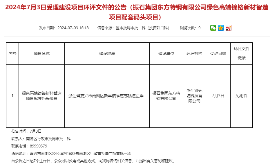 7月3日,振石集團(tuán)東方特鋼有限公司綠色高端鎳鉻新材智造項(xiàng)目配套碼頭項(xiàng)目環(huán)評文件獲受理公告,公告期:7個(gè)工作日。