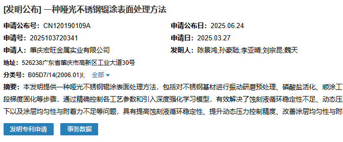 2025年6月24日,肇慶宏旺金屬實(shí)業(yè)有限公司成功申請一項(xiàng)名為“一種啞光不銹鋼輥涂表面處理方法”專利,申請公布號為CN120190109A,申請日期為2025年3月27日。